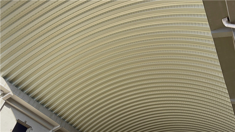 本次拱形波紋鋼屋面采用914-610型結(jié)構(gòu),拱跨18.10米,長度85.82米,總覆蓋面積超1500㎡。屋面選用冠洲品牌彩涂卷,厚度1.0mm,正面海藍色、背面灰白色,兼顧耐腐蝕性與視覺協(xié)調(diào)性。