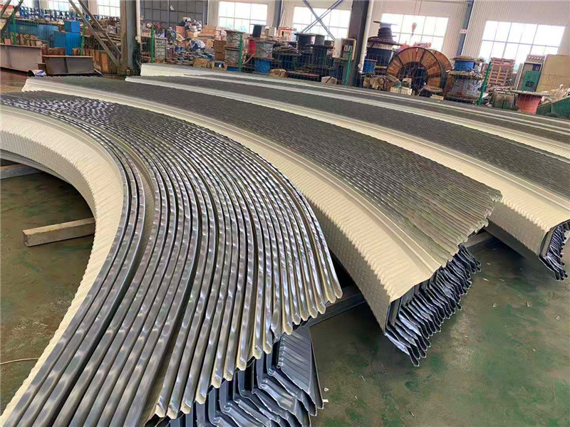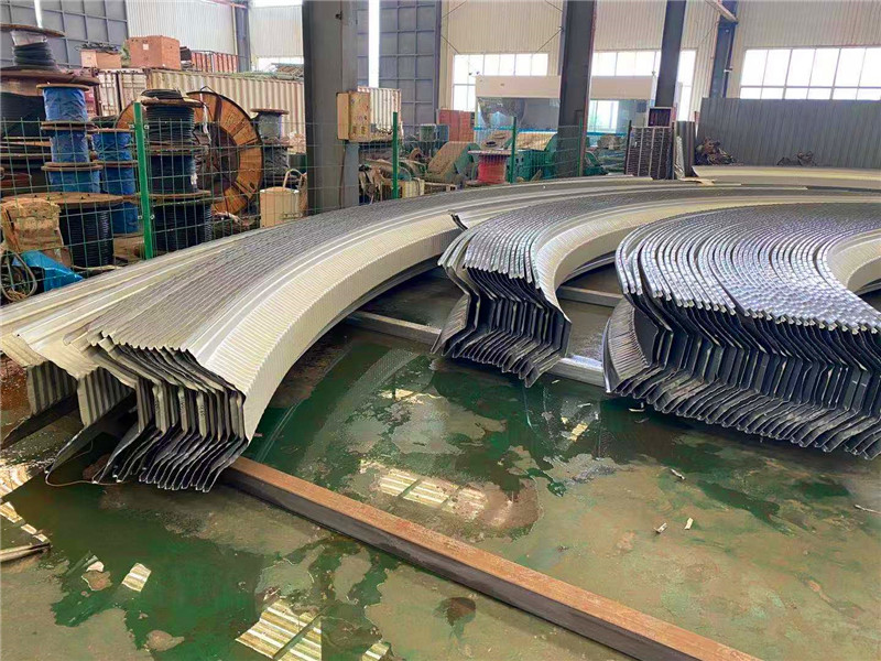 本次拱形屋頂單元板工程主要服務(wù)于某出口型廠房的建筑改造升級,客戶對結(jié)構(gòu)穩(wěn)固性、現(xiàn)場加工效率及防護(hù)性能提出了較高要求。根據(jù)需求,江蘇杰達(dá)鋼結(jié)構(gòu)工程有限公司選用了厚度為1.2mm的鋼板原材料,壓制成寬度為0.61m的成型瓦片,并采用現(xiàn)場彎板壓型技術(shù)進(jìn)行施工。