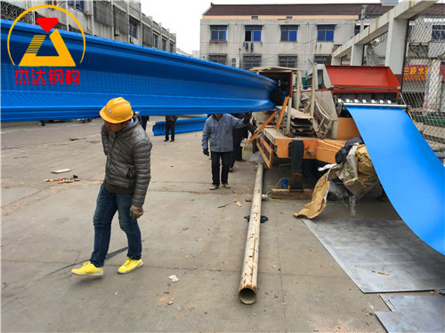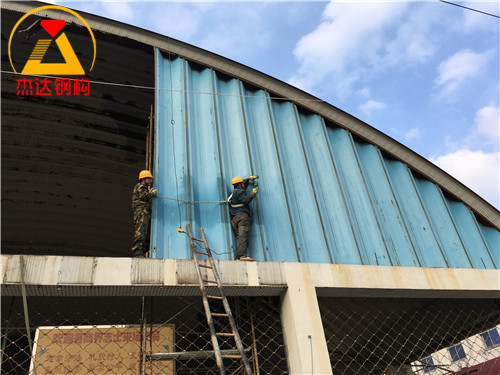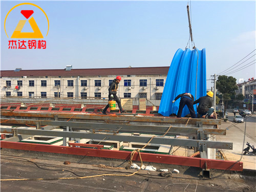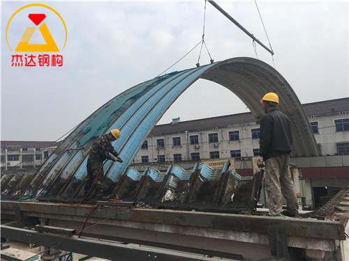 • 安裝階段:拱形屋頂瓦由杰達無梁拱設備現(xiàn)場壓型成型,逐榀吊裝拼接,完成后再依次安裝山墻瓦及過道屋面板。