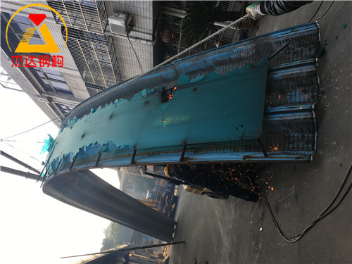 舊屋面拆除工作于2016年12月15日正式啟動,杰達鋼構團隊分階段進行施工,先拆除兩側過道雨篷及山墻,后用25T吊車與氣割配合完成舊拱形屋面的整體拆除。
