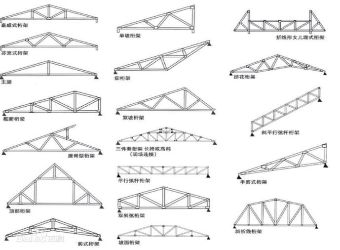 一種由桿件彼此在兩端用鉸鏈連接而成的結(jié)構(gòu)。桁架由直桿組成的一般具有三角形單元的平面或空間結(jié)構(gòu),桁架桿件主要承受軸向拉力或壓力,從而能充分利用材料的強(qiáng)度,在跨度較大時(shí)可比實(shí)腹梁節(jié)省材料,減輕自重和增大剛度。桁架的優(yōu)點(diǎn)是桿件主要承受拉力或壓力,可以充分發(fā)揮材料的作用,節(jié)約材料,減輕結(jié)構(gòu)重量。常用的有鋼桁架、鋼筋混凝土桁架、預(yù)應(yīng)力混凝土桁架、木桁架、鋼與木組合桁架、鋼與混凝土組合桁架。