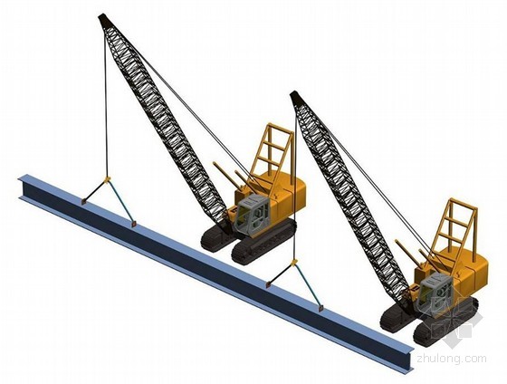 2、拼裝完成后鋼梁跨度較大,采用兩臺履帶吊進行抬吊,設(shè)置4個吊點,保證吊裝合力方向延長線與鋼梁1/3分段點相交。