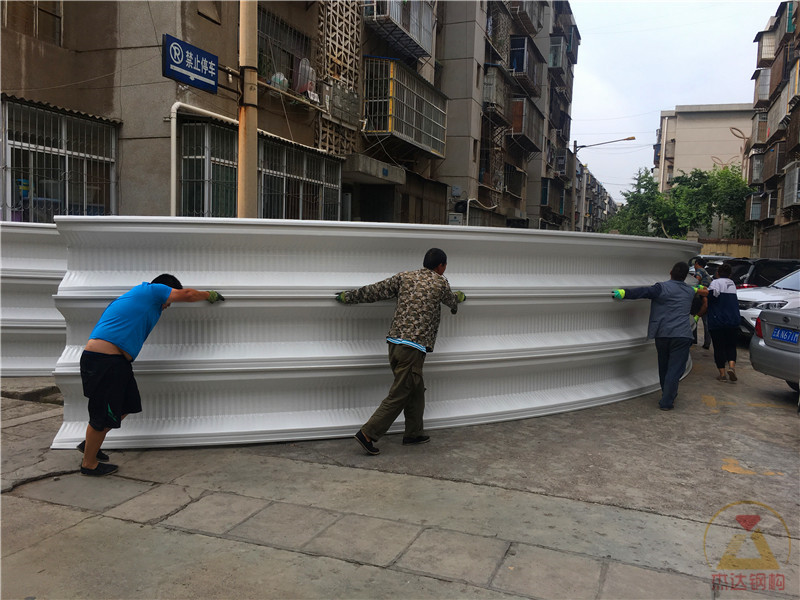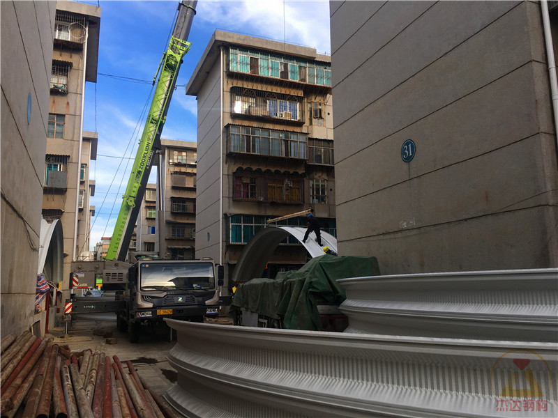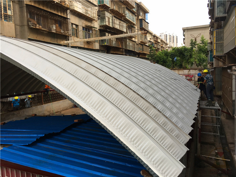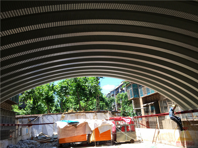 本工程位于云南省昭通市卷煙廠職工小區(qū)內,涉及兩棟拱形屋頂結構的改造,跨度均為12米,長度分別為40米和60米。施工環(huán)境復雜,人員來往頻繁,場地狹窄,給施工帶來了較大難度。然而,憑借豐富的施工經驗,施工團隊通過加班加點,僅用5天時間完成了車棚拱形屋頂的拆換工作,獲得了業(yè)主及小區(qū)居民的一致認可。