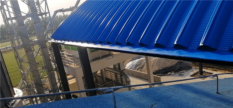 本次倉間罩棚工程采用拱形屋頂結(jié)構(gòu),整體建筑跨度為18米,長度達80米,總面積為1440平方米。屋頂材料選用了臺灣尚興1.0mm TS280GD-Z高強彩涂卷,表面顏色為海藍色,兼具防腐性與耐候性。