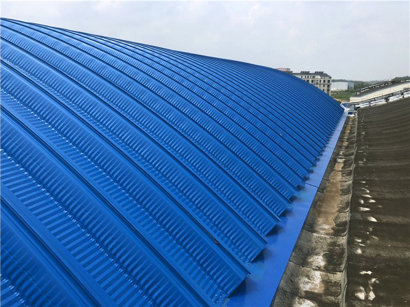 拱形屋頂采用模塊化冷彎技術(shù)進(jìn)行現(xiàn)場(chǎng)成型與安裝,確保瓦片排列整齊,排水順暢。屋頂兩側(cè)均加裝泛水板包邊,同樣使用海藍(lán)色彩涂板,厚度為0.5mm,既起到防滲防漏的作用,又統(tǒng)一了整體外觀風(fēng)格。