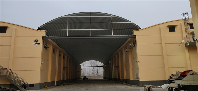 本工程位于江蘇省連云港和茂糧庫內(nèi),罩棚結(jié)構(gòu)為拱形屋頂形式,整體跨度約18米,長度80米,采用的屋面板材為海藍(lán)色,厚度為1.2mm,材料為TS280GD-Z鍍鋅鋼板,具備良好的防腐與承重性能。