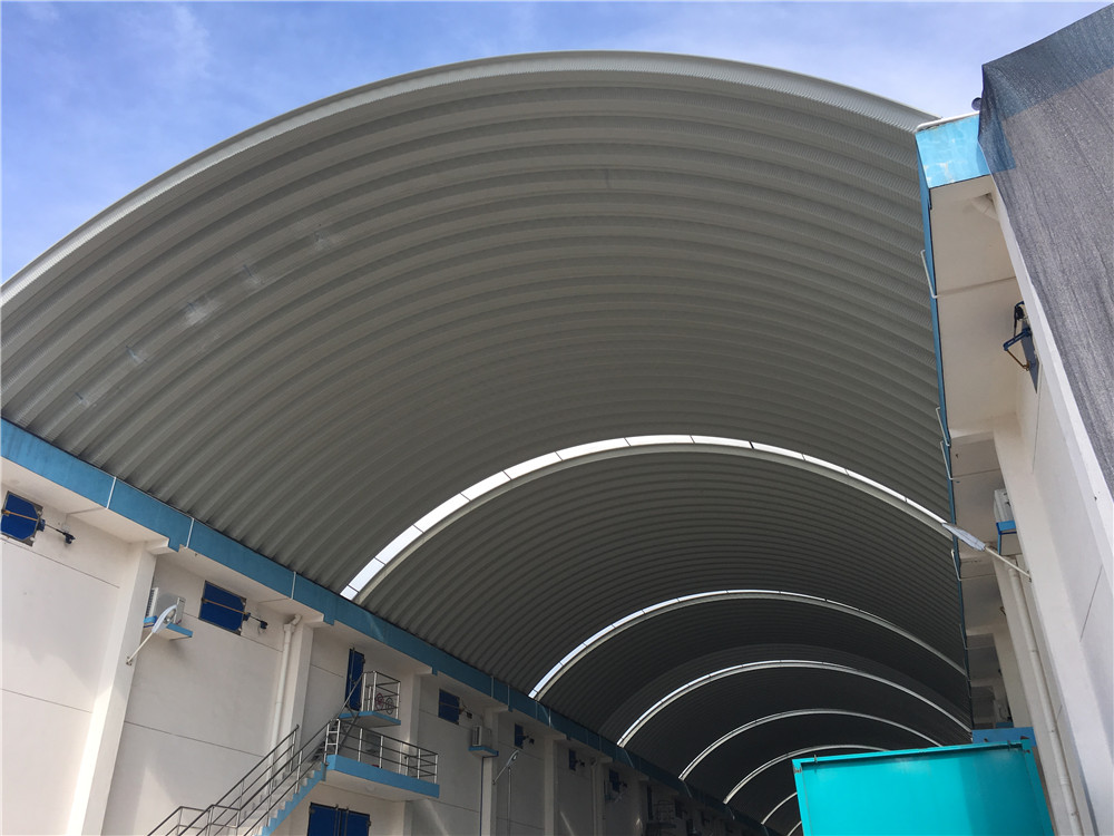 在拱形屋面瓦片之間,施工方通常會(huì)預(yù)留61公分的空位,用于鋪設(shè)采光板。中部結(jié)構(gòu)采用5×5公分鍍鋅角鋼支撐,為陽(yáng)光板提供牢固基礎(chǔ)。陽(yáng)光板鋪設(shè)后,通過(guò)5.5×25mm鍍鋅鉆尾釘進(jìn)行錨固,增強(qiáng)抗風(fēng)性能。