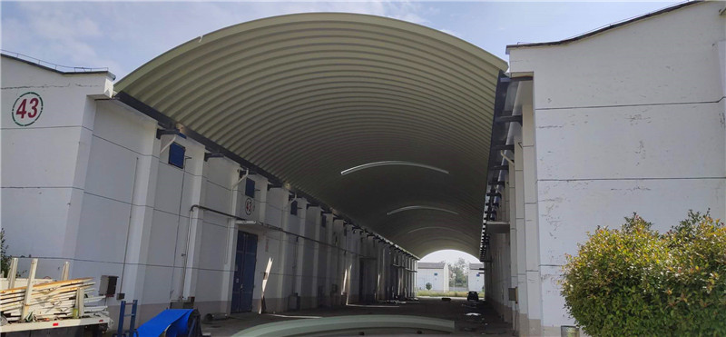 施工完成后的拱形屋頂罩棚整體外觀整潔,結(jié)構(gòu)穩(wěn)固,采光帶布局合理,為倉儲(chǔ)環(huán)境提供了良好的保障。