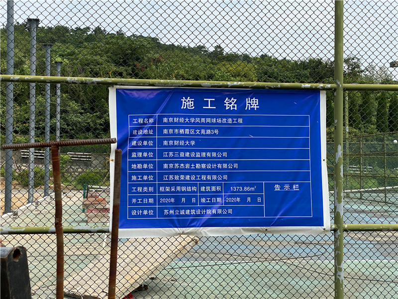 施工銘牌顯示,本次工程位于南京棲霞區(qū)的風(fēng)雨網(wǎng)球場改造項目,施工單位為江蘇杰達鋼結(jié)構(gòu)工程有限公司,確保施工質(zhì)量符合相關(guān)規(guī)范。