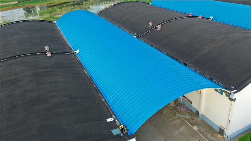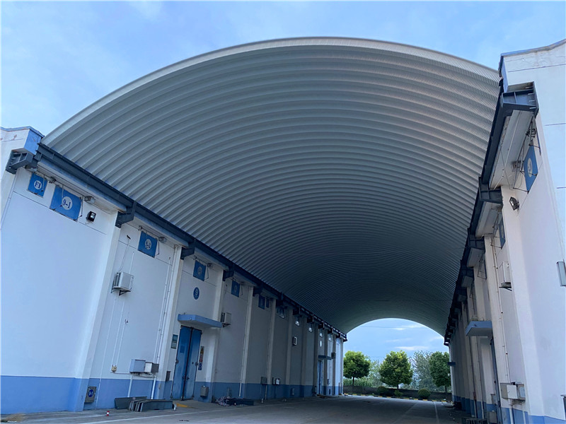 本項(xiàng)目罩棚跨度為16米,長度達(dá)60米,三棟罩棚總面積超過3000平方米。設(shè)計(jì)采用圓弧形金屬拱殼結(jié)構(gòu),既保證了結(jié)構(gòu)的穩(wěn)定性,也滿足了倉間罩棚的功能需求。