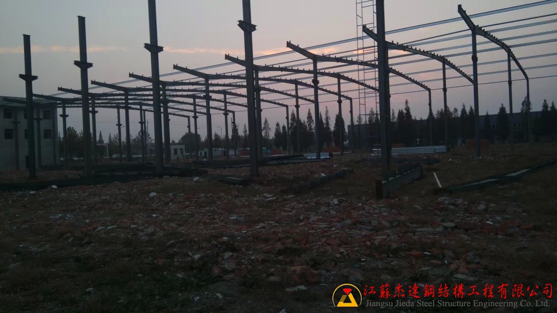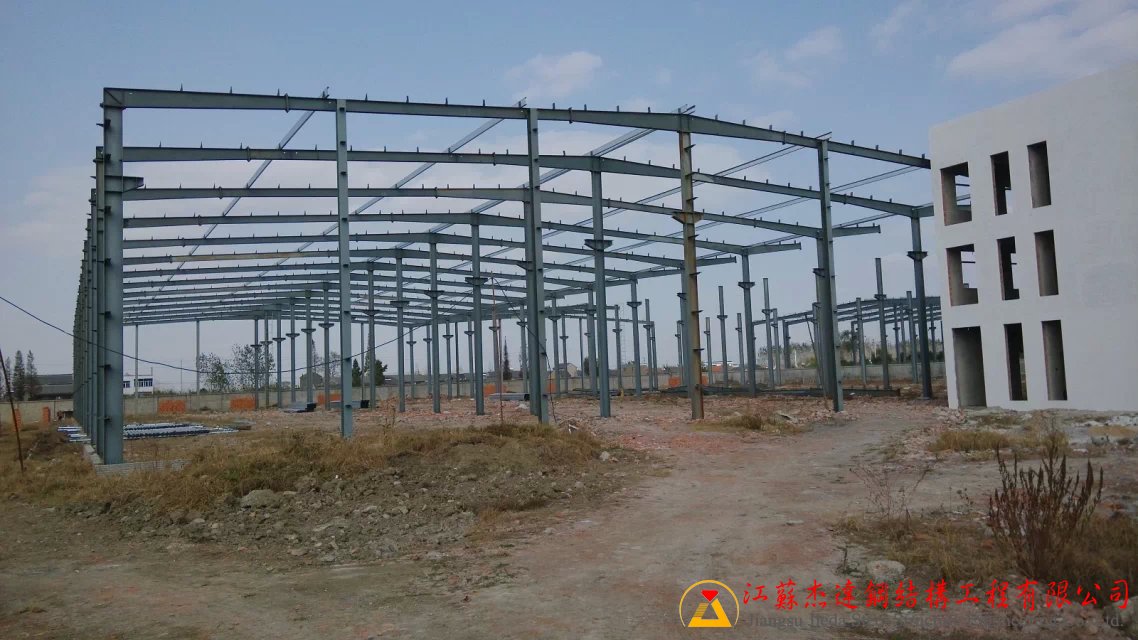 本工程為全鋼結(jié)構(gòu)五連跨車間,采用多跨鋼架設(shè)計,確??臻g利用最大化。主體鋼架部分由江蘇杰達鋼結(jié)構(gòu)工程有限公司負責鋼梁的加工與制作,保證結(jié)構(gòu)的質(zhì)量和施工進度。