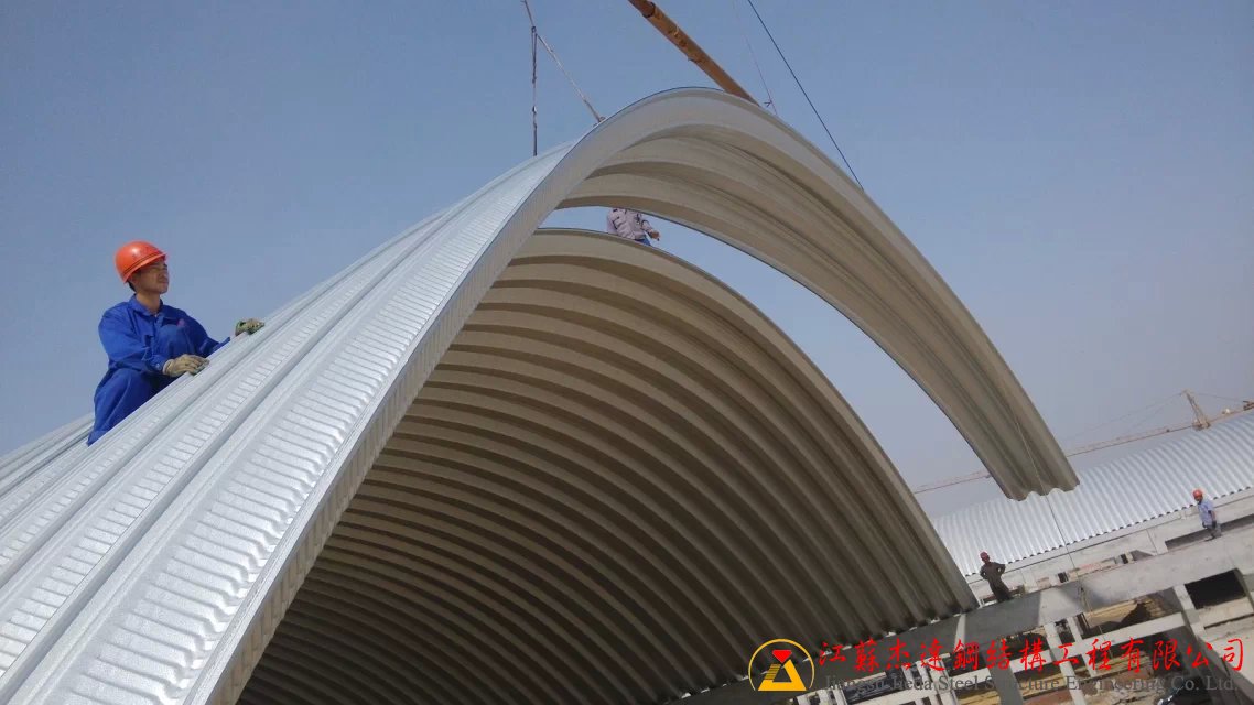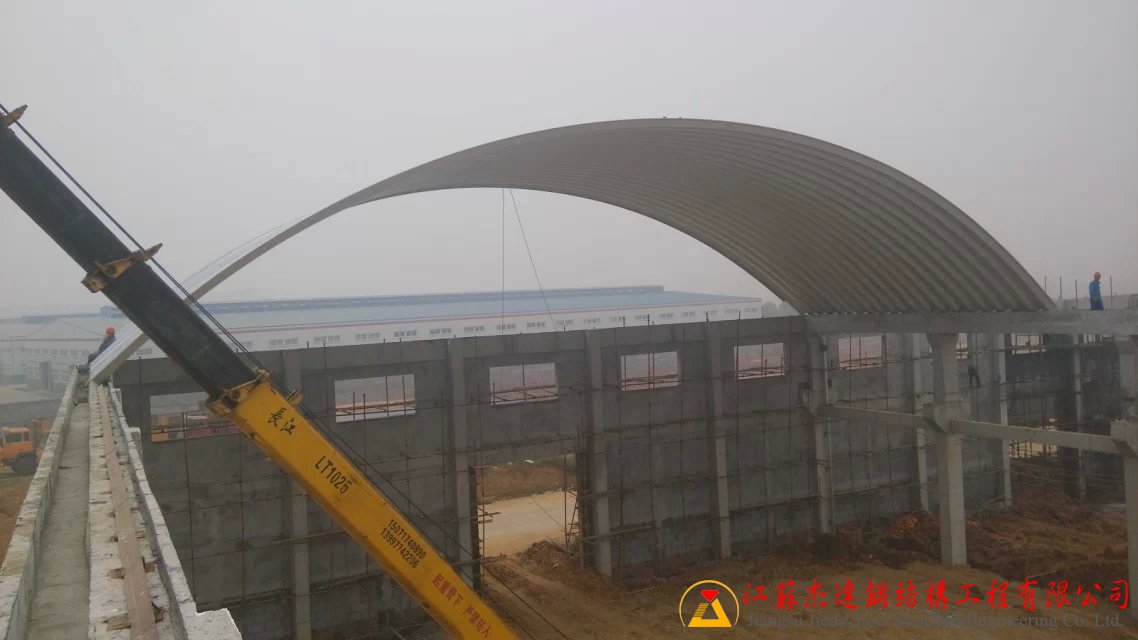 本次拱形屋頂工程施工面積達8萬多平方米,施工單位江蘇杰達鋼結(jié)構(gòu)工程有限公司憑借豐富的鋼結(jié)構(gòu)施工經(jīng)驗,采用科學施工方案,確保項目質(zhì)量和進度。施工中嚴格執(zhí)行安全管理制度,加強現(xiàn)場監(jiān)控,保障施工安全無事故。